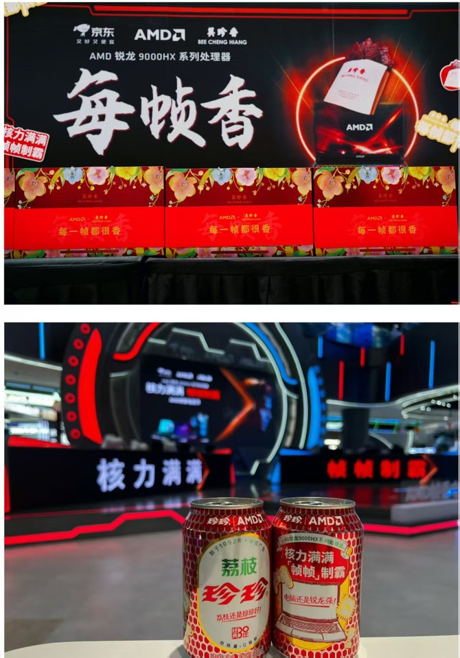 在本次 AMD 帧香电竞节现场,AMD 突破传统硬件领域的合作框架,创新性携手百年匠心肉品品牌美珍香、全国销量第 一的荔枝饮料品牌珍珍,以 “性能体验 + 味蕾享受” 的双维融合,为玩家打造 “帧香电竞” 的沉浸式快乐场景。美珍香用传承百年的工艺,将肉品的鲜香转化为玩家激战中的能量补给,将 AMD锐龙9000HX的“每一帧都香”升华了感官。珍珍荔枝汽水则作为陪伴数代人的“童年快乐水”,为热血对战注入 “霸汽畅爽” 的情绪价值,让AMD锐龙9000HX的“帧帧制霸”留下绵密气泡爽感。