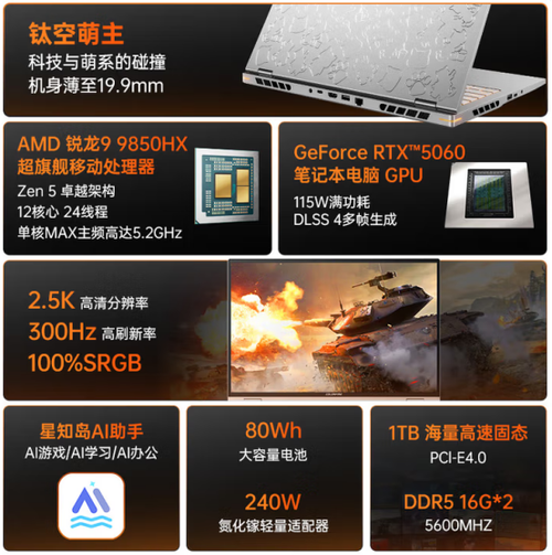 R9 9850HX+RTX 5060+2.5K 300Hz+32GB+1TB版本原价11299元,新品首发直降1000元,全国大部分地区国补再减 2000元,开门红再减300元,到手价仅7999.2元;R9 9850HX+RTX 5070+2.5K 300Hz+32GB+1TB版本原价12299元,新品首发直降1000元,全国大部分地区国补再减 2000元,开门红再减300元,到手价仅8999元。