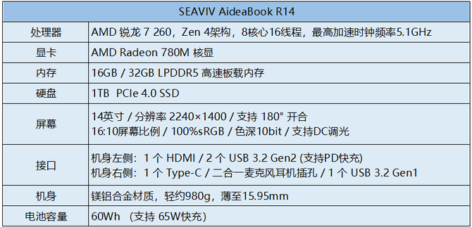 除了精致的外观、轻薄的重量,在实际工作场景中,性能才是决定使用体验的重要因素。一般来讲,轻薄本受限于机身体积,性能相对孱弱,只能满足简单的 Office 办公需求。 SEAVIV AideaBook R14 搭载了 AMD Ryzen 7 260 处理器,8 核心 16 线程,最高加速频率可达 5.1GHz,并集成AMD Radeon 780M 高性能核心显卡,内存规格为 16GB、最高可选配至 32GB 的大内存,搭配 1TB PCIe 4.0 高速固态硬盘的存储组合,固态硬盘支持更换升级,为后续根据需求扩展存储容量留出了充足空间。下面让我们进入实际测试环节,看看 SEAVIV AideaBook R14 的性能表现如何。