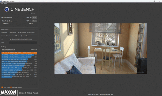 处理器性能方面,我们使用 CINEBENCH R23 进行跑分实测。AMD Ryzen 7 260 处理器多核成绩 13366 pts,单核成绩 1677 pts。这一跑分成绩充分体现了其强劲的多任务处理能力与单线程响应速度,意味着在同时运行文档处理、图片处理、视频后期等工作常用程序时,能保持流畅切换不卡顿。无论是进行复杂表格数据运算、多图层图像编辑,还是处理中等规模的代码编译任务,都能高效完成。对于需要频繁在多任务间切换的职场人士、创意工作者来说,这样的性能表现为日常办公和轻度创作需求提供了稳定可靠的支撑,确保工作流程连贯高效。