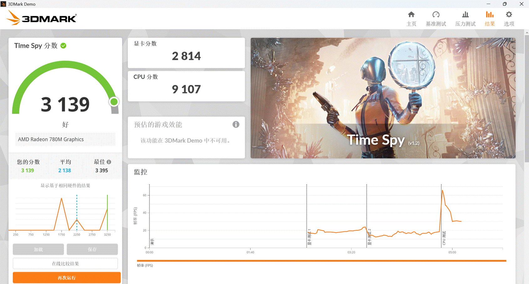 接着看 Radeon 780M 显卡的性能。在 3DMark 的 Time Spy 项目中,显卡得分 2814 分,综合得分 3139 分。得益于双通道内存设计,核心显卡性能得到最佳释放,使其性能比肩独立显卡,能够满足图像处理等创意类工作的需求。