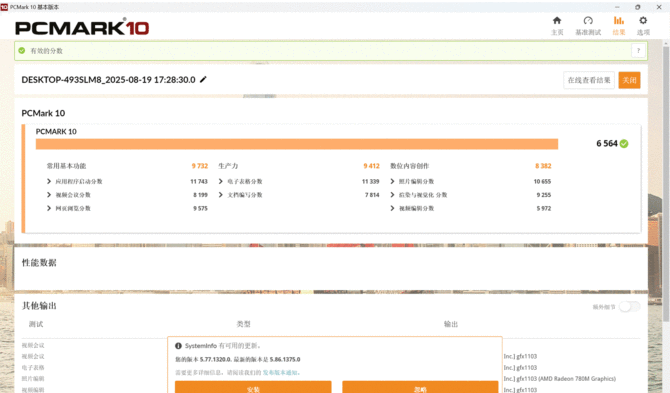 首先是 PCMark 10 的现代办公测试,其总分达到了 6564 分,其中常用基本功能与生产力两项测试成绩都接近 1 万分,表明其在 Office 办公软件、视频会议等办公场景下的性能表现非常优秀。这样的分数直观反映了其在办公场景中的实用性能:即使同时运行多份 Office 文档、在线会议软件和后台文件同步,操作也始终流畅无卡顿,大型表格的运算和文档保存速度也能满足日常高强度办公的需求,并且还配备了 Wi-Fi 6E 无线网卡,在高密度办公环境下依旧能保持稳定高速的网络连接,为视频会议与文件传输提供更可靠的支持。