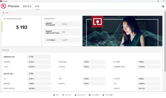 SEAVIV AideaBook R14 的屏幕有着 2.2K 的分辨率及 覆盖100% sRGB 的广色域色域和10bit色深,用来进行创意类工作也非常合适,我们使用 Procyon 的照片编辑基准测试进行跑分,通过调用图片处理中最常用的Adobe Photoshop 与 Lightroom软件来进行日常使用情况的模拟测试,其最终得分为5193分,在测试过程中,无论是处理多图层叠加的 Photoshop 复杂文件,还是批量调整 Lightroom 中的 RAW 格式图片参数,操作过程都流畅无卡顿。对于摄影师、设计师等创意工作者而言,这样的表现足以满足日常修图、调色等专业需求,让创意落地过程高效且精准。