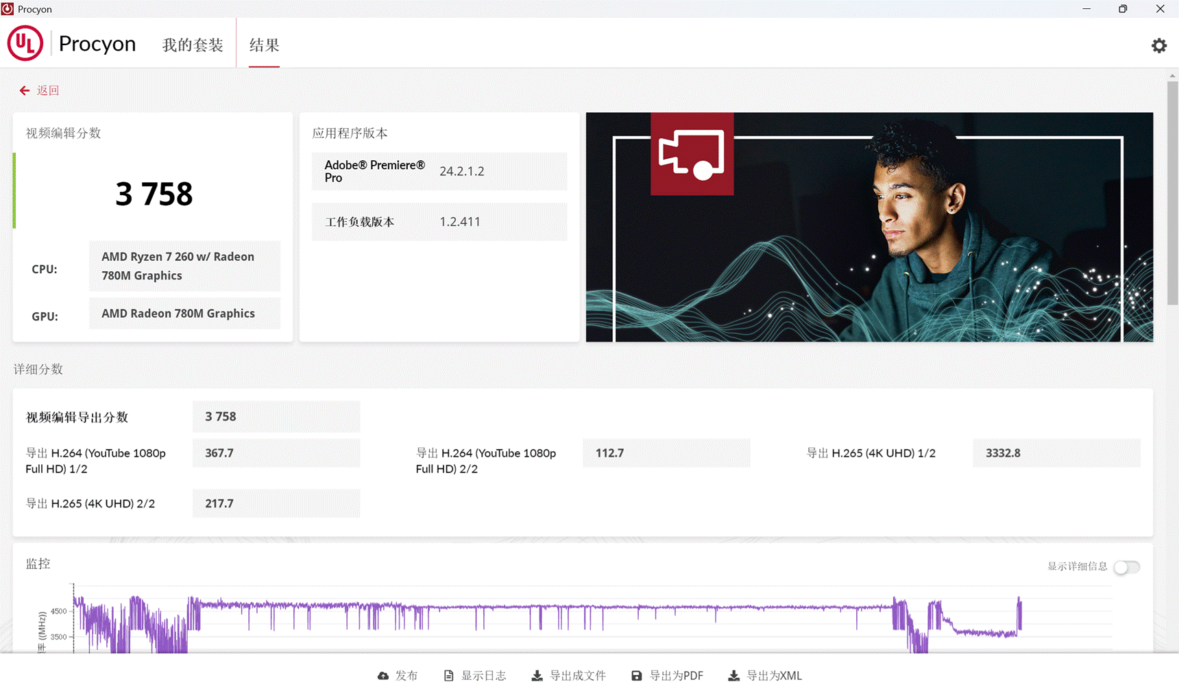 为验证其实际表现,我们采用 Procyon 视频剪辑基准测试进行专业评估,该测试通过调用行业主流的 Adobe Premiere Pro 软件,模拟真实剪辑场景中的素材加载、时间线预览、效果添加及导出等核心流程。最终测试得分为 3758 分,这一成绩在同级别轻薄本中处于上游水平,对于自媒体创作者、职场内容制作者等用户群体而言,这样的表现完全能满足日常需求 —— 无论是制作产品宣传短片、会议记录剪辑,还是个人 vlog 创作,无需依赖笨重的高性能工作站,仅凭这台重量不足 1kg 的轻薄本就能高效完成从素材剪辑到成品导出的全流程,真正实现 “轻装创作” 的使用体验。