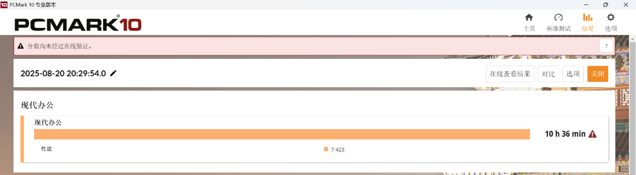 在续航表现方面,SEAVIV AideaBook R14 同样展现出了稳健的水准。我们通过 PCMark 10 的现代办公续航测试来模拟日常使用,最终成绩为 10小时36分。这意味着在典型办公场景下,从早间开机处理邮件、文件编辑,到下午的视频会议和文档整理,再到傍晚的资料查阅与结果导出,都能够覆盖完整的工作日,而无需频繁寻找电源插座。对于经常需要外出办公或在不同会议场所之间切换的职场人士而言,10小时的续航成绩确保了工作节奏的连续性与稳定性,让移动办公更加从容。