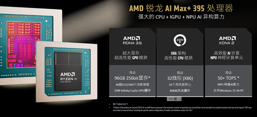 据介绍,锐龙 AI MAX+ 395 处理器采用 “CPU+IGPU+NPU”的异构算力混合架构,搭载台式机级别创新的 “Zen 5” CPU 核心,拥有 16 个高性能核心与 32 线程,80MB 高速缓存,最高加速时钟频率可达 5.1GHz,为复杂计算任务提供强劲算力支撑。