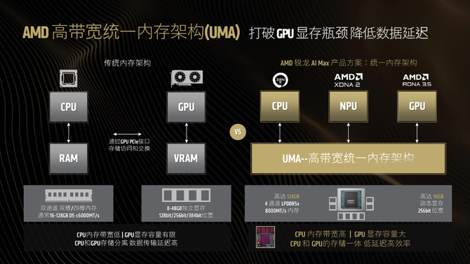 在内存架构方面,锐龙 AI MAX+ 395 采用高带宽统一内存架构(UMA)技术,彻底打破了传统内存架构中 CPU 与 GPU 存储分离的瓶颈,让CPU内存带宽变高,让GPU显存容量增大,CPU和GPU的存储一体化,大幅降低数据传输延迟,从而提升数据处理效率。