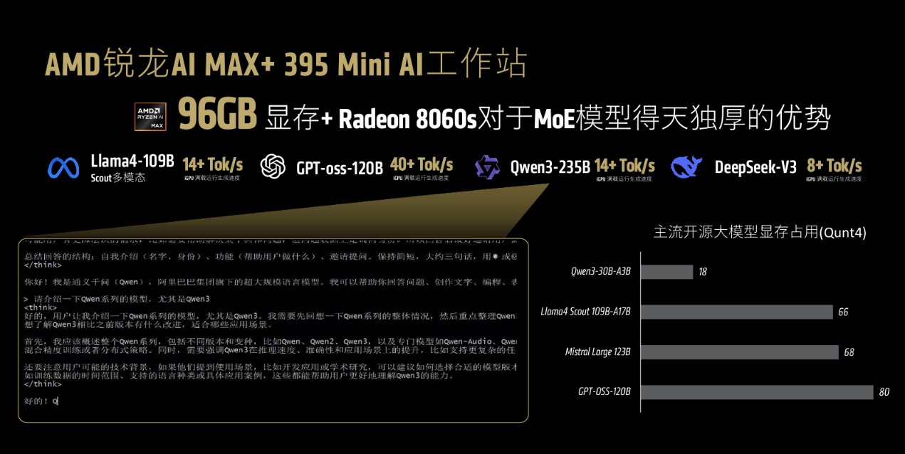 实测数据显示,基于该处理器的 Mini AI 工作站在主流开源MoE架构大模型运行中表现优异,如 Llama4-109B、Qwen3-235B 模型 iGPU 满载运行生成速度均达 14+Tok/s,GPT-OSS-120B 模型更是达到 40+Tok/s,为大模型端侧部署提供强大算力保障。