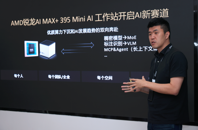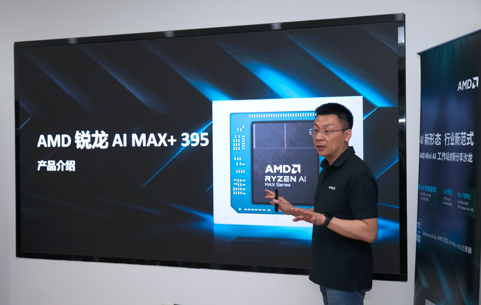 2025 年 9 月 9 日,AMD 在北京举办了一场小型的 Mini AI 工作站创新分享沙龙,AMD大中华区市场营销副总裁纪朝晖、AMD大中华区家用产品市场总监廖金宁、AMD 大中华区AI市场经理昝仲阳等相关负责人参加了此次沙龙活动,聚焦 “AI 新形态,行业新范式”,并重点介绍了以锐龙 AI MAX+ 395 处理器为核心的 Mini AI 工作站解决方案,旨在打通 AI 赋能行业的 “最后一公里”,为端侧与边缘 AI 推理提供优选平台,推动 “AI + 千行百业” 迈入快车道。