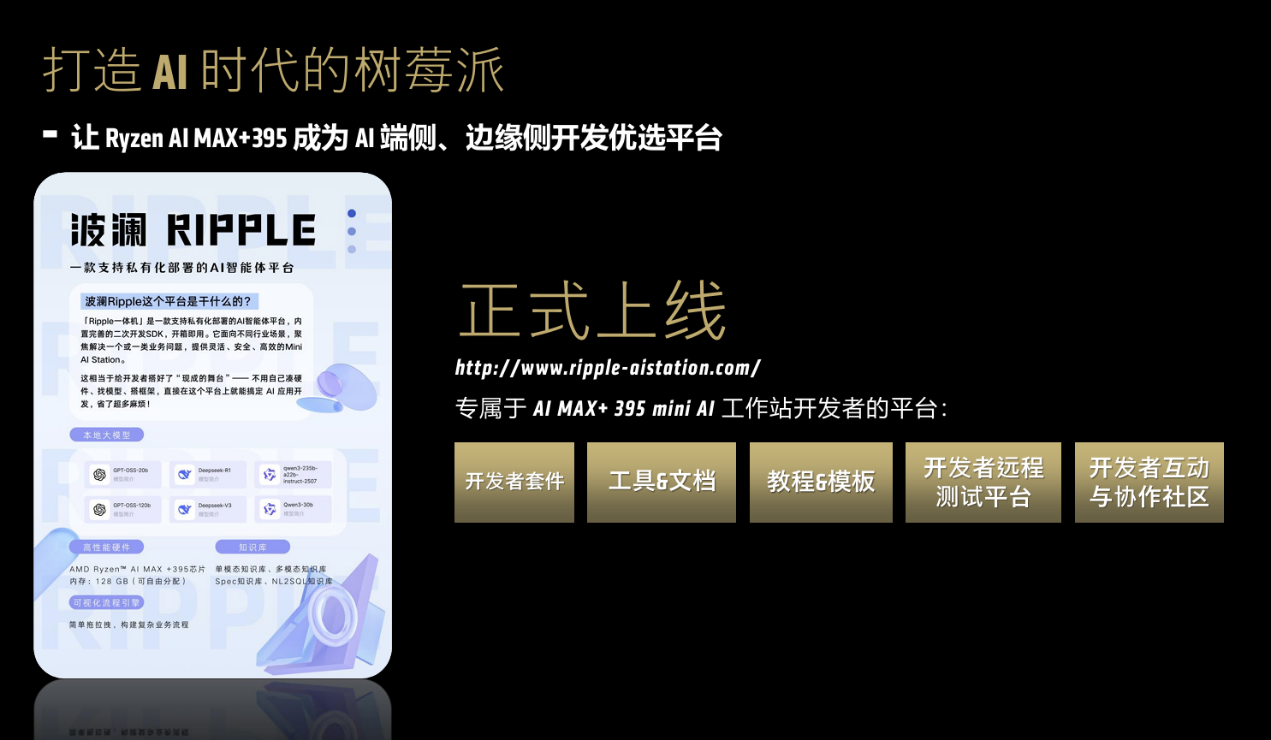 2024年,AMD 携手众多 AI 生态伙伴成立了 “AMD 中国AI应用创新联盟”,涵盖办公、教育、设计、数据分析等多个领域上百家合作伙伴,未来也将充分调动该联盟成员共同加速Mini AI工作站的相关生态建设和商用场景落地。同时,AMD携手生态伙伴Ripple 为开发者打造出专属平台,提供开发者套件、工具、文档、教程模板以及远程测试平台与协作社区,助力开发者基于锐龙 AI MAX+ 395 快速实现 AI 应用创新,推动端侧与边缘侧 AI 生态繁荣。