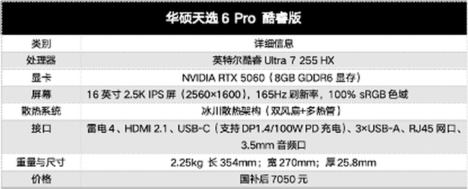 华硕天选6 Pro酷睿版则瞄准了学生党的需求,也2025年性价比非常高的旗舰级游戏本,搭载英特尔酷睿Ultra 7 255HX处理器与NVIDIA RTX 5060显卡,通过硬件协同与AI优化实现高帧率与体验的平衡。核心配置包括16GB DDR5 5600MHz内存(可扩展)、1TB PCIe 4.0 SSD(双M.2插槽),以及2.5K 165Hz高色域屏,支持杜比全景声与RGB影刃键盘,细节配置全面。