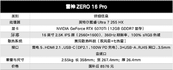 显卡方面,雷神 ZERO 16 Pro 配备 140W 满血版 RTX 5070 Ti 独显,基于 Blackwell 架构设计。屏幕采用2.5K 360Hz 高刷屏,画面细节清晰可见,操作响应迅速。散热系统采用黑洞架构(双风扇+7 热管),结合AI 智能调节技术,高负载下噪音控制在 45dB 以内,C 面温度不超过 42℃,兼顾性能与静音。
