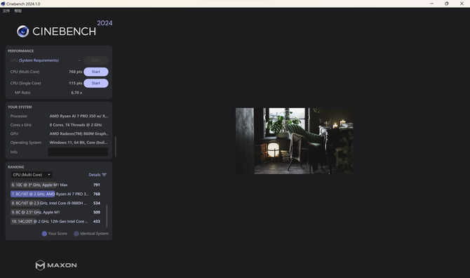 在处理器测试中,Cinebench R23 实测多核成绩 13665 pts,单核成绩 1959 pts;Cinebench 2024 中多核成绩 768 pts,单核成绩 115 pts,体现出其在多核计算与单线程响应上的均衡表现。