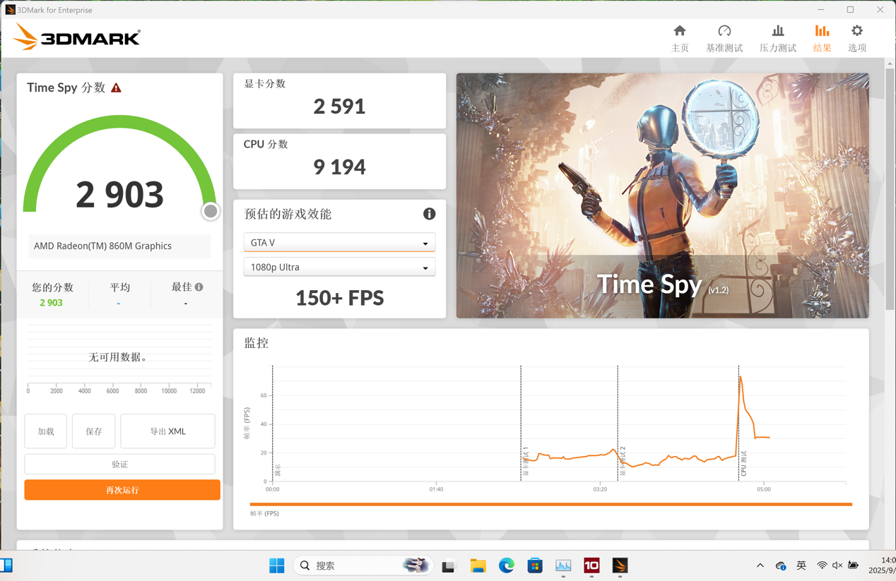 显卡性能方面,3DMark Time Spy 测试综合得分 2903 分,其中显卡分数 2591 分,CPU 分数 9194 分,说明其集成显卡不仅能够满足日常图形处理,也能在轻度娱乐与创意场景中保持稳定输出。