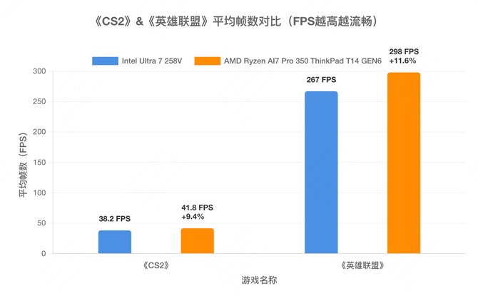 作为考察图形性能的实际应用,在游戏性能方面,T14 Gen 6 也带来了一定的惊喜。凭借RDNA 3.5架构的 Radeon 860M集显,《英雄联盟》在原生分辨率低画质情况下,实测平均帧数达到 298 帧,相较搭载酷睿Ultra 7 258V的商务本帧率高出11.6%;《CS2》在系统推荐画面质量配置下,运行创意工坊benchmark,平均帧数为 41.8 帧,相比同类定位的Intel平台帧率也高出9.4%。尽管它并非一款游戏本,但可以看出,它也能够带来流畅的图形性能体验,满足日常的图形处理需要。