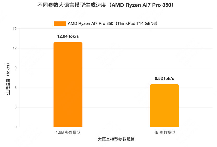 在本地运行大语言模型时,T14 Gen 6 在 1.5B 和 4B 参数模型的生成速度分别达到 12.94 tok/s 和 6.52 tok/s,7B 参数模型也能比较流畅地运行。