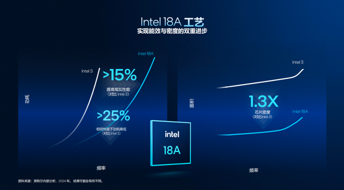 PowerVia 技术则专注于解决芯片供电问题,通过将供电网络下沉到晶圆的背部,释放了正面的布线空间,提升了芯片的密度和单元利用率。这一技术减少了约 30% 的压降,为高频电路提供了更干净的电流,从而提高了芯片的能效表现。在相同功耗下,Intel 18A 工艺可实现超过 15% 的每瓦性能提升;而在相同性能下,功耗则可降低超过 25%。同时,芯片密度也提升到了前一代的 1.3 倍,这意味着在更小的芯片尺寸下,能够发挥更强大的性能。