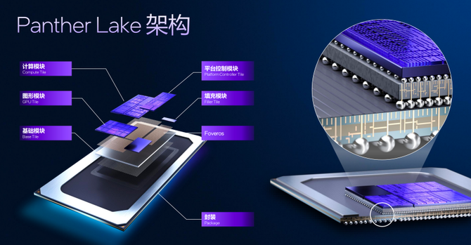 在封装技术方面,Panther Lake 采用了 Foveros-S 工艺,这是一种成熟的 2.5D 封装技术,能够将不同的功能模块灵活堆叠,实现高效堆叠和低延迟互连。这种封装方式使得 Panther Lake 的计算模块、图形模块、平台控制模块和基础模块能够紧密集成在一起,构建出一个规格灵活、性能强劲、能效卓越的下一代计算平台。与前代的 Meteor Lake 和 Arrow Lake 相比,Panther Lake 的封装技术在集成度和性能表现上都有显著提升,为产品的多样化配置和高性能输出提供了有力支持。