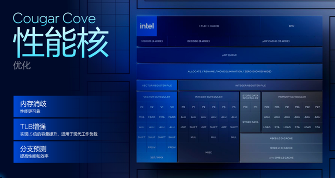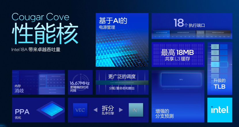 性能核 Cougar Cove 基于 Intel 18A 制程工艺,继承了前代 Lion Cove 的优秀性能,并在此基础上进行了多项优化。它拥有 18 个执行端口和高达 18MB 的 L3 缓存,相比 Lunar Lake 的 12MB 提升了 50%。此外,Cougar Cove 还引入了 AI 启发式学习算法进行电源管理,能够根据用户使用场景的实时动态变化,更精准地调配内部硬件资源,充分发挥核心性能,同时避免不必要的能效浪费。在分支预测方面,Cougar Cove 进一步增强了预测性能,提高了预测的准确性和效率,从而提升了 CPU 的整体性能。