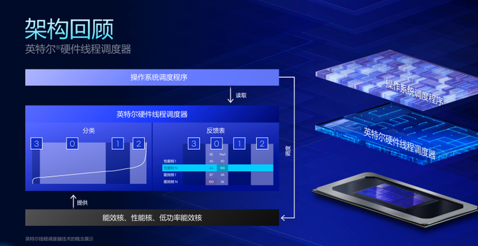 为了更好地发挥混合核心架构的优势,Panther Lake 引入了英特尔硬件线程调度器。该调度器能够智能识别并区分不同类型的工作负载,并根据负载特性将其分配到最适合的核心上执行。通过优化分类模型和反馈表,调度器能够更准确地感知每个核心在特定负载下的性能与能效表现,从而为操作系统提供更精准的调度参考。