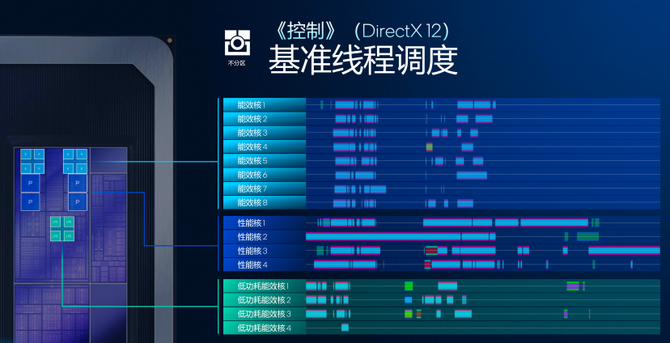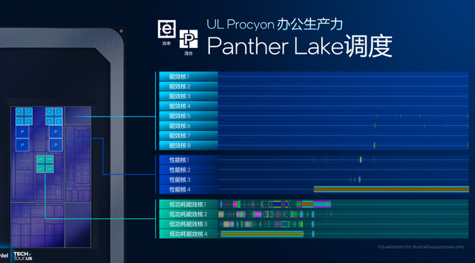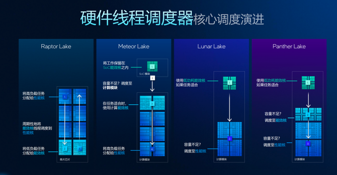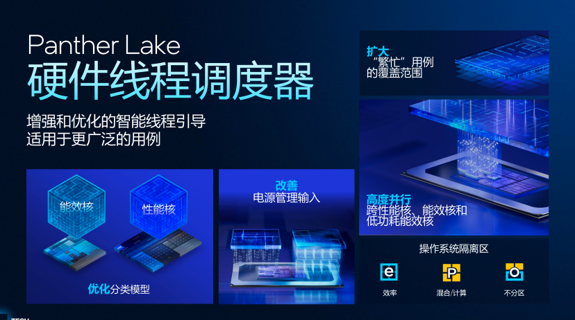 在实际应用中,无论是办公软件、生产力工具还是游戏场景,Panther Lake 的硬件线程调度器都能够根据实时负载情况,灵活地在性能核、能效核和低功耗能效核之间进行任务调度,实现性能与能效的最佳平衡。
