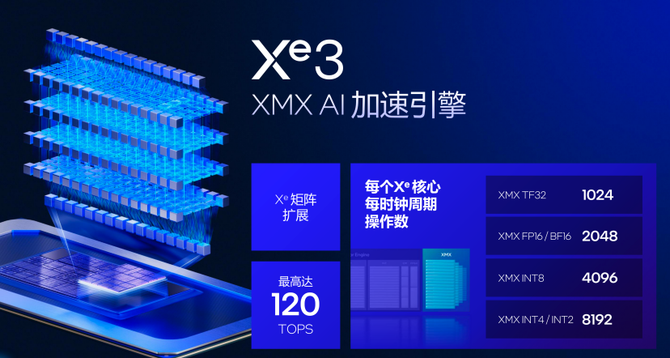 在性能优化方面,Xe3 对从引擎到切片的各个关键计算单元进行了全面升级。第三代 Xe 核心提供了 8 个 512 位矢量引擎和 8 个 2048 位 XMX 引擎,L1 缓存增加了三分之一,进一步提升了核心的计算能力和数据处理效率。Xe 矢量引擎的线程数增加了 25%,并添加了可变寄存器分配,有效提升了引擎的使用效率。此外,Xe3 还支持原生 FP8 反量化、SIMD16 原生 ALU、三路并发、扩展数据指令集与 FP64,以及 Xe 矩阵扩展,这些特性使得 Xe3 在处理复杂图形计算任务时更加高效。