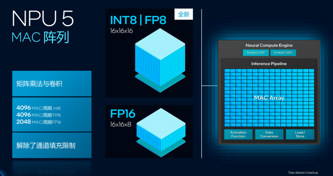 除了 GPU,Panther Lake 还引入了新一代的 NPU(神经处理单元),为 AI 应用提供了强大的加速能力。NPU5 在架构设计上保持了一致性,旨在让 NPU 惠及更多 AI PC,同时进一步优化效率。与前代的 NPU4 相比,NPU5 在每个神经计算引擎中拥有更大的 MAC 单元,虽然将每个 Slice 中的神经单元数量从 6 个减少到 3 个,但每个神经计算引擎的计算能力却翻倍,有效提升了整体运算效率和芯片面积利用率。