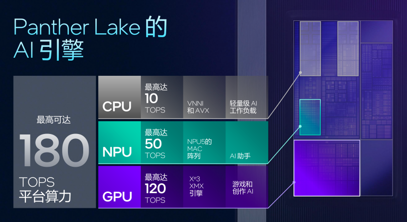 Panther Lake 的 SoC 整体算力达到了 180TOPS,其中 CPU 贡献 10TOPS,NPU 贡献 50TOPS,GPU 贡献 120TOPS。这种多引擎协同的架构设计,使得 Panther Lake 能够根据不同负载的需求,灵活调配计算资源,实现 1+1+1>3 的协同效应,为用户带来更智能、更高效的计算体验。