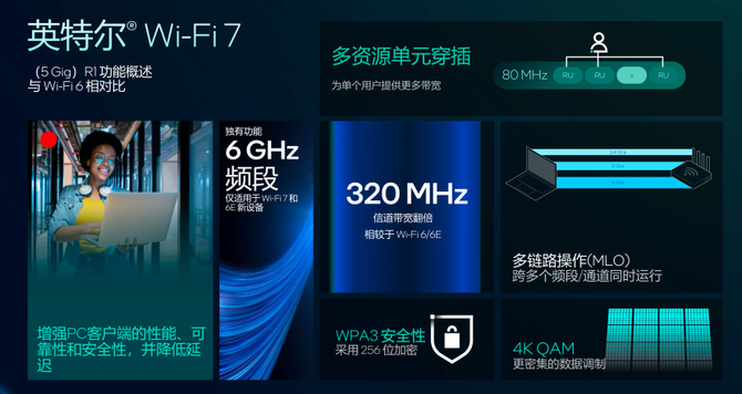 在无线连接方面,Panther Lake 引入了最新的 Wi-Fi 7 和蓝牙 6.0 技术,为用户提供了更快速、更稳定、更可靠的无线连接体验。Wi-Fi 7 支持 5GHz 频段,信道带宽达到 320MHz,是前代产品的 2 倍。它还支持 4K QAM 调制、跨多个信道的并发操作以及业界领先的 WPA3 安全性加密。这些特性使得 Wi-Fi 7 在性能、可靠性和安全性方面都得到了显著提升,同时减少了客户端的延迟。