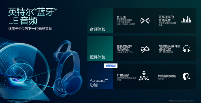 蓝牙 6.0 也进行了多项升级,支持 LE 音频,采用最新的编码器,与经典蓝牙相比,功耗降低了高达 50%,同时提升了音频质量。LE 音频还实现了多流音频,支持真无线立体声耳机和增强耳机的音频切换。此外,蓝牙 6.0 还支持 Auracast™,能够广播音频并连接助听器,支持更多的外设。Panther Lake 的蓝牙 6.0 还支持信道探测功能,通过 TOS(往返时间)飞行时间测距和相位测距,能够精准测定设备与 AP 之间的距离,提高了查找设备功能的精度,并显著节省了蓝牙设备的功耗。