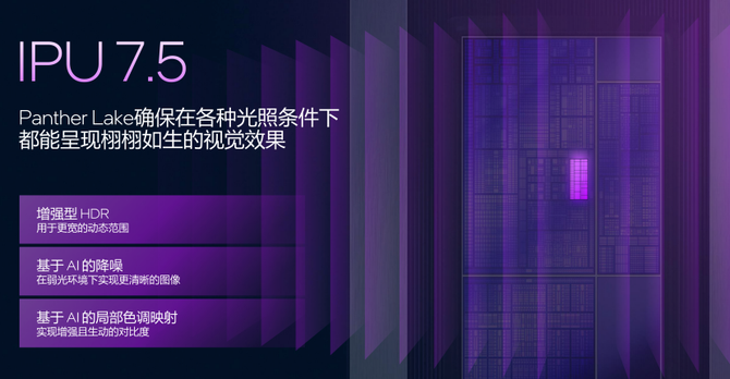 新一代 IPU(图像处理单元)架构也是 Panther Lake 的一大亮点。IPU7.5 在图像处理方面进行了多项创新,提供了增强型 HDR、基于 AI 的降噪和 AI 驱动的局部色调映射等功能。增强型 HDR 通过双重曝光交错技术,能够捕捉亮部和暗部的细节,生成具有更高动态范围的照片。基于 AI 的降噪功能可以在弱光环境下实现更清晰的图像,提高照片的清晰度和帧速率。AI 驱动的局部色调映射则能够改善照片的对比度,实现更生动的视觉效果。