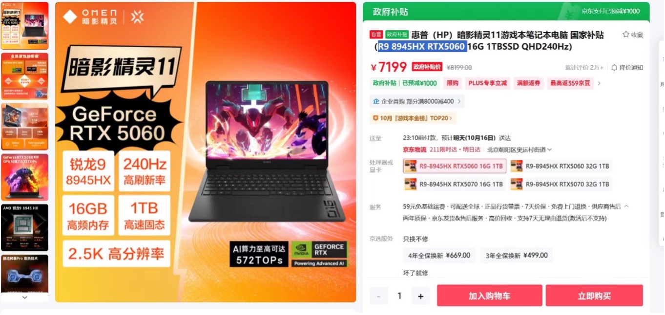 在这个双十一,不妨给自己一个升级装备的理由,选择暗影精灵11锐龙版R9-8945HX RTX5060游戏本,补贴后只需要7199元,就可以开启你的专业电竞之旅!