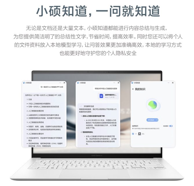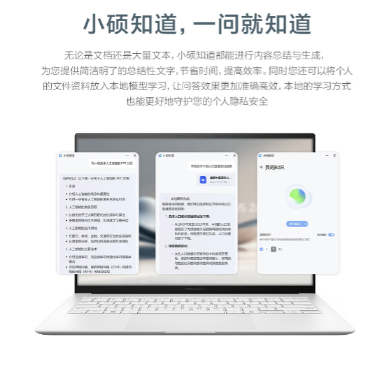 搭载全新Intel AI Boost NPU与“小硕知道”AI智能助理,更能为工作和生活带来全新的AI智能体验!无论是文档还是超大量文本,交给小硕,光速了解、总结核心内容;还支持智慧问答、个人知识库构建,不用担心隐私问题,文件一键放入本地模型,回答效果更准确,隐私保护更彻底,即使在断网环境下依旧可以访问本地模型,继续为您答疑解惑,飞机、高铁等没有网络等环境依旧保持工作效率。