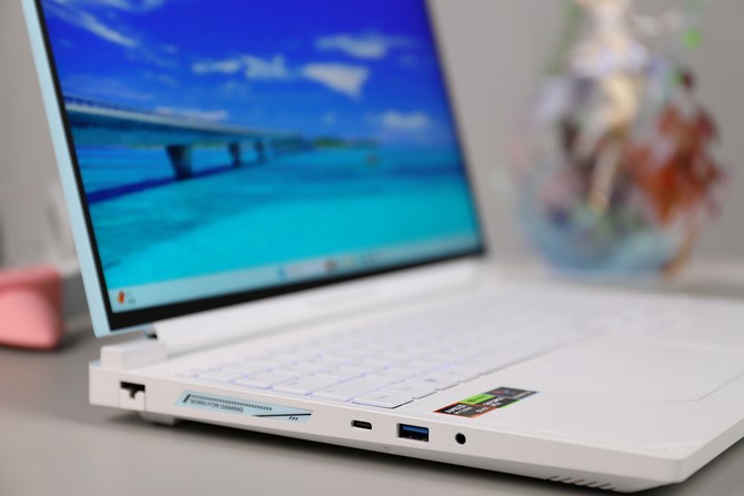 机身左侧边设有镭射铭牌,进一步彰显了猎刃系列的电竞基因。笔记本的机身线条流畅,边角采用了圆润的处理方式,手感舒适,同时也让整机看起来更加轻薄。