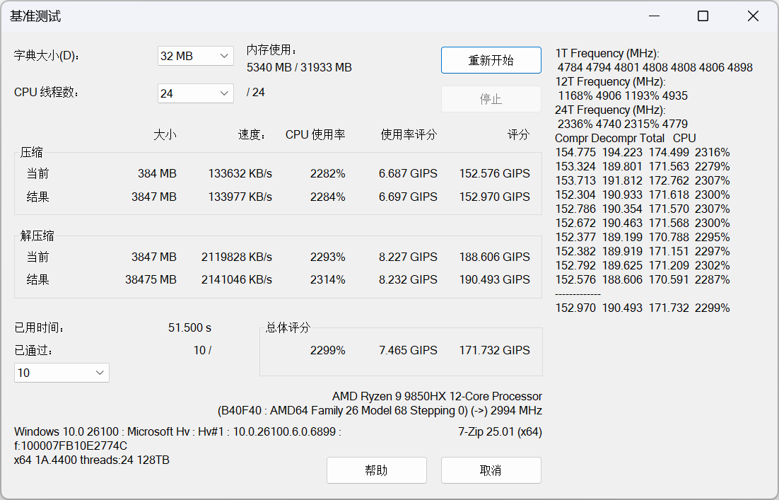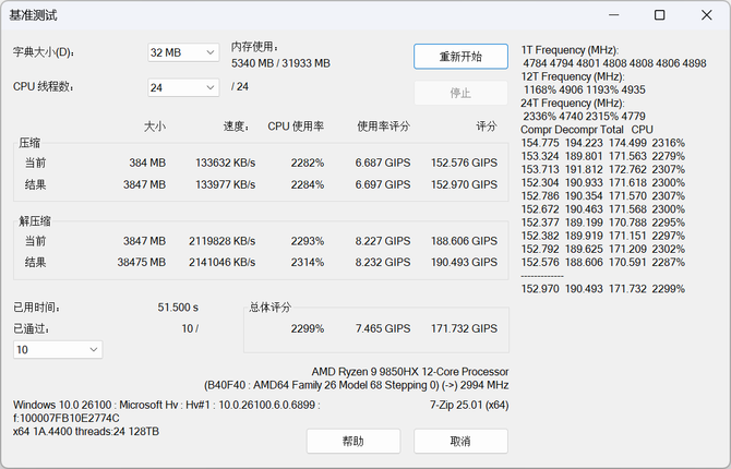 7-ZIP 软件的基准测试主要用于评估计算机硬件性能以及检测内存错误,同时也能反映 7-ZIP 软件在特定硬件环境下的压缩和解压缩效率。对于CPU而言,通过模拟 LZMA 压缩和解压缩过程,衡量 CPU 的运算速度。测试会分别考察单核与多核性能,展示处理器在单线程和多线程任务处理时的能力,帮助用户了解 CPU 在压缩相关任务中的表现。结果可见,总体评分171.732 GIPS,这是一个很不错的成绩了。