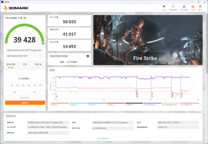 Fire Strike主要测试经典的高负载下显卡 DX11 性能。结果可见,综合得分达 39428。