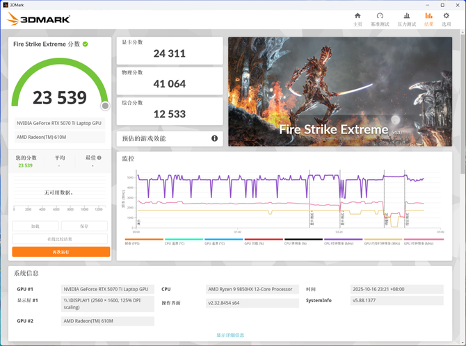 Fire Strike Extreme 的测试中,显卡得分 24311,综合得分 23539。