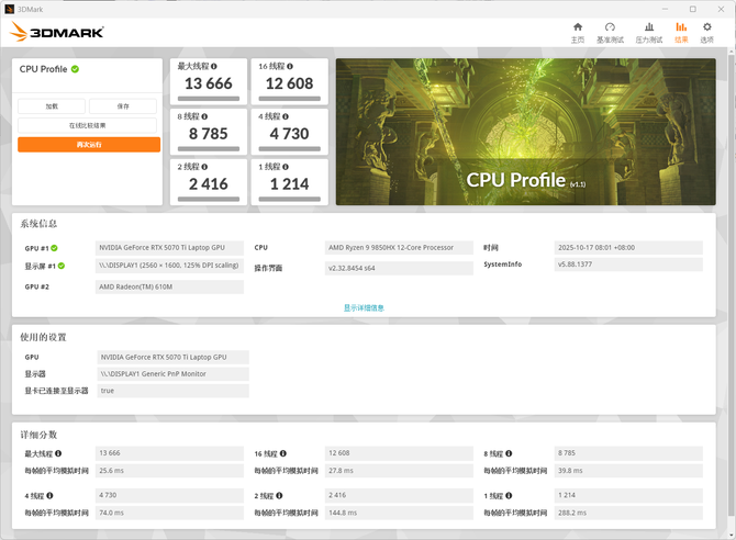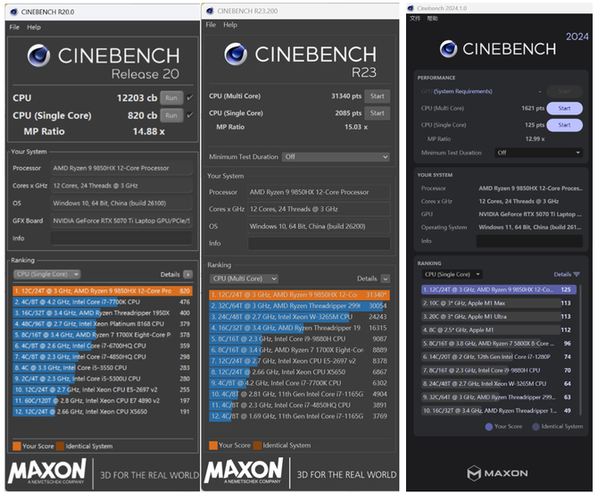 继续来通过一些跑分软件来看看锐龙9 9850HX 处理器的性能表现。测试时的室内温度20℃,显卡驱动32.0.15.8157(NIVIDA 581.57),Windows 11家庭中文版,版本号25H2。系统电源模式为最佳性能,智能控制中心性能控制模式为狂暴、极速模式,电池100%满电连接电源。