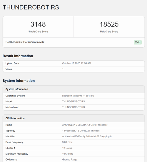 Geekbench 的最新版本测试中,单核性能成绩为3148,多核得分18525。