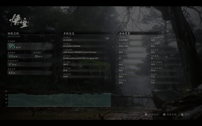 《黑神话:悟空》Benchmark测试,1600分辨率,画面设置为超高,帧生成开启,最终获得95帧的平均帧率,意味着用雷神猎刃 S Ultra玩黑神话毫无压力。