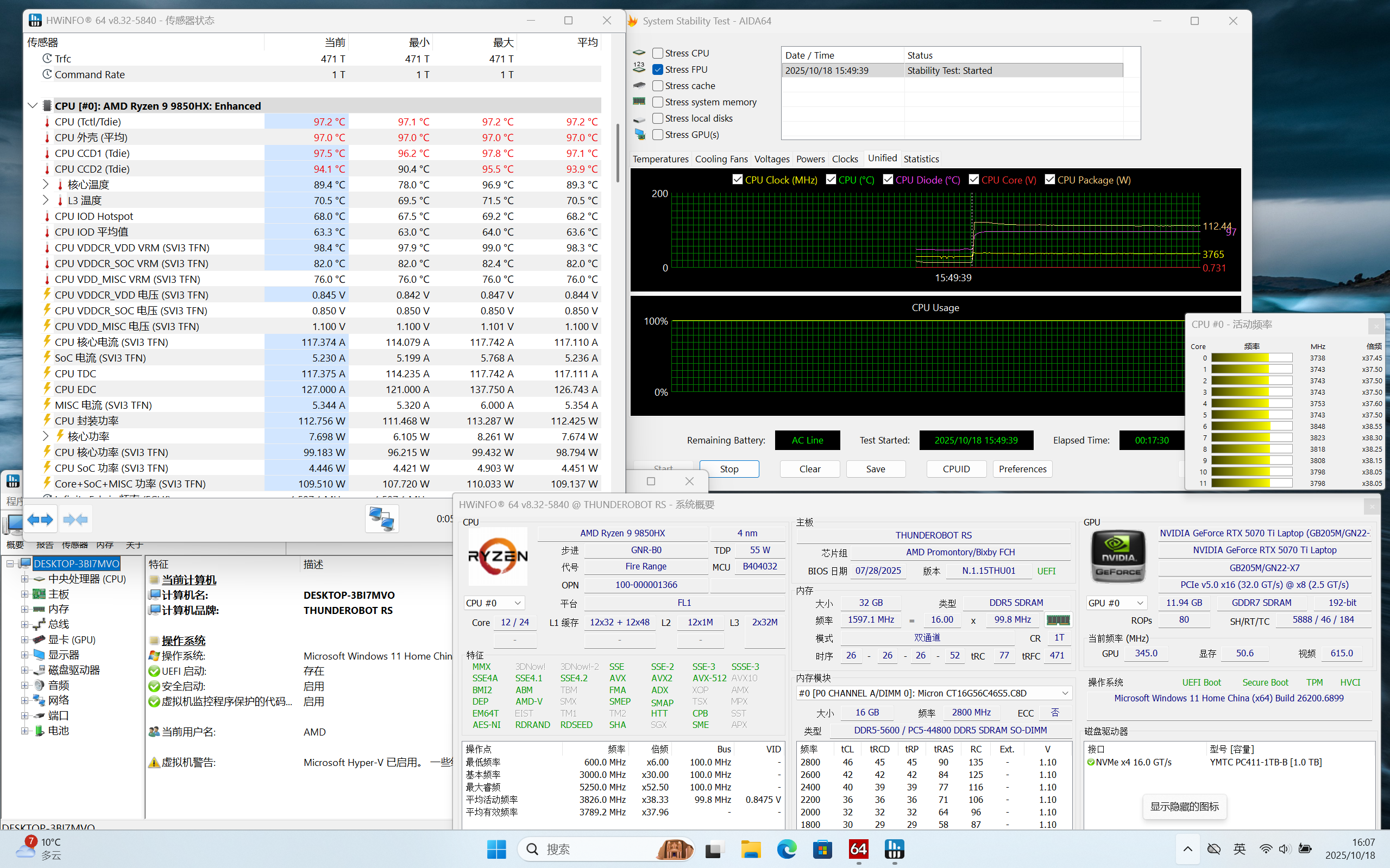以上就是雷神猎刃 S Ultra笔记本核心硬件的测试,锐龙9 9850HX 处理器 + RTX 5070Ti 显卡的组合,以及搭载的双通道32GB 内存(16GB×2)、1TB SSD,不仅可以满足日常办公、高负载应用的内容创作,运行3A游戏亦能非常流畅,各项测试的表现,可以说雷神猎刃S Ultra相当全能且很接近旗舰水平。