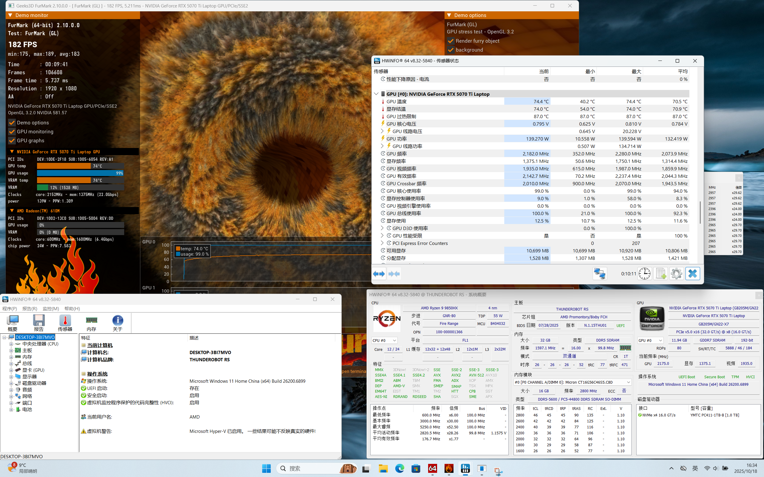 首先来看一下GeForce RTX 5070Ti 笔记本电脑 GPU在雷神猎刃 S Ultra上的功耗表现,测试的条件如上。我们使用FurMark 2.10.0版进行压力测试,1080P分辨率,连续运行9分钟,GPU功率139.27W,温度74.4℃,运行曲线稳定,也说明在散热的调校上很优秀。