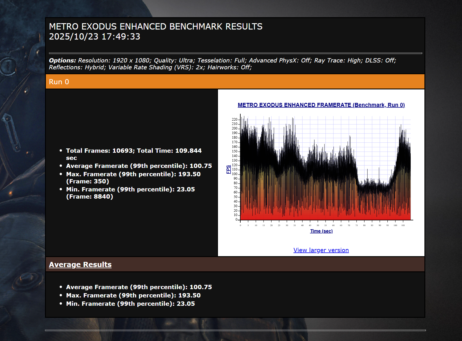 《地铁:离去》的游戏测试,1080P,Ultra模式,平均帧率100fps。