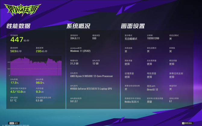 《界外狂潮》的游戏测试中,1200分辨率,阴影质量优异,光线追踪关,垂直同步关,最终平均帧率达到447帧/秒,非常流畅。