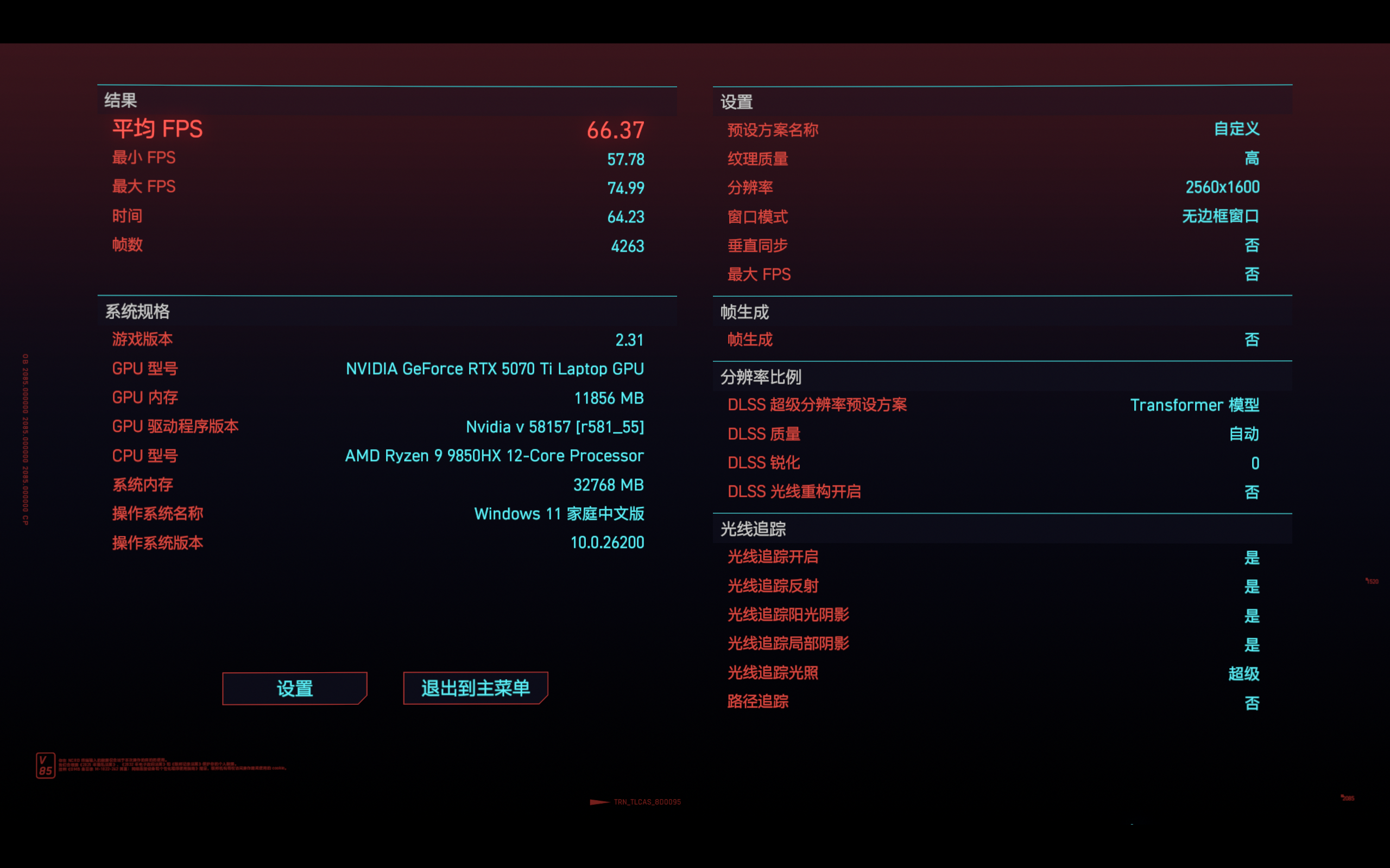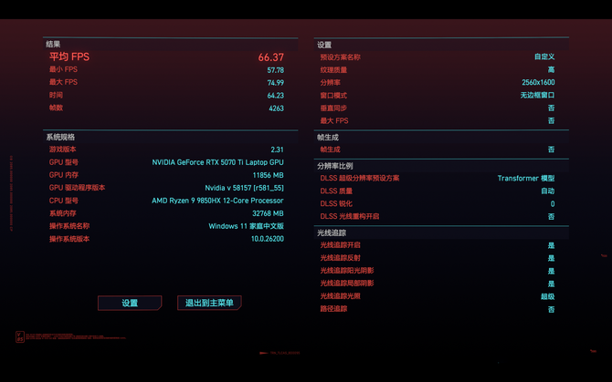 《赛博朋克2077》的测试,1600分辨率,纹理质量高,光追开启,平均帧率66,在不损失画面细节的情况下,依然可以流畅运行。