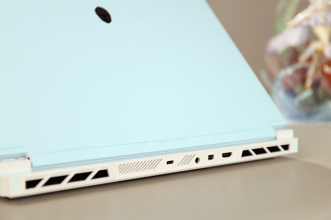 机身后侧的端口包括:1 个 USB-C 3.2 Gen2 10Gbps 接口(支持 PD 100W & 140W 私有协议);1 个 miniDP 接口和 1 个 HDMI 2.1 (48Gbps)接口,用户可以通过这两个接口连接多个外接显示器,实现多屏扩展,提升办公和游戏体验;此外还有电源接口,用于连接原装适配器为笔记本供电。