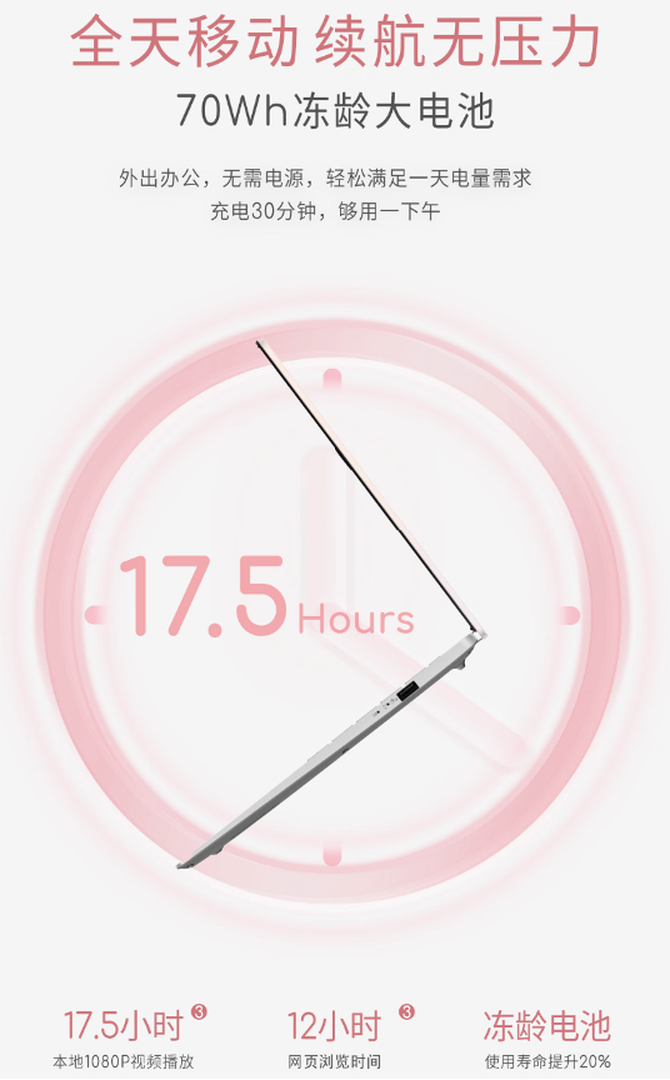 便携性之外,续航能力是移动场景下的关键需求。华硕a豆14 Air 悦享版内置70Wh冻龄大电池,实现至高17.5小时全天级“冻龄”续航(支持本地1080P视频播放17.5个小时,完全能满足学生党全天上课、图书馆自习、职场女生外出开会、跑客户的续航要求,更贴心的是,支持快充技术,充电半小时就能使用一下午,临时出门前快速补电,再也不用担心电量不足影响使用。