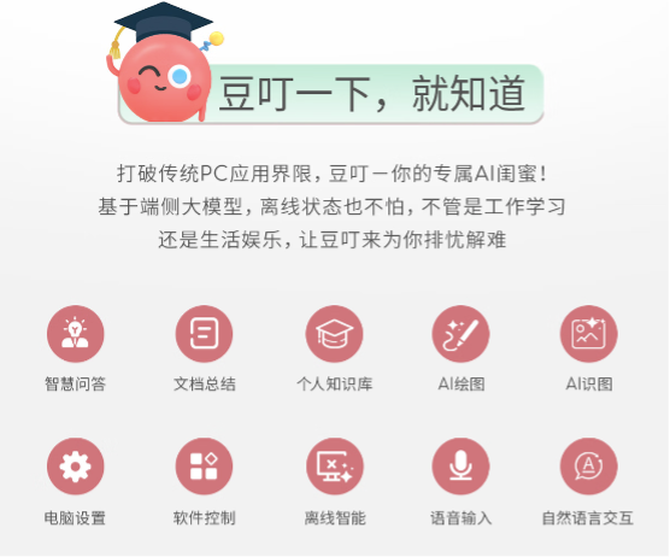 而“豆叮知道”支持本地部署,断网状态下依然可以使用,在没有网络的教室、图书馆或户外场景中,也能随时享受AI助力,文件查找、文档总结依旧可用!