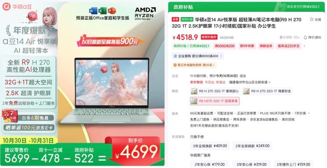 如此高颜高能的AI轻薄本,双11期间更是带来诚意满满的优惠政策,双11立减活动叠加部分地区政府补贴,到手仅4518.9元起,更有白条6期免息、晒单返100元京东E卡等活动,让入手门槛大幅降低!购机还能免费享受a豆无忧服务计划,包含2年整机国际联保、2年无限远程协助、2年硬件专家上门服务,使用更安心。点击下面链接,选购属于你的华硕a豆14 Air悦享版吧!