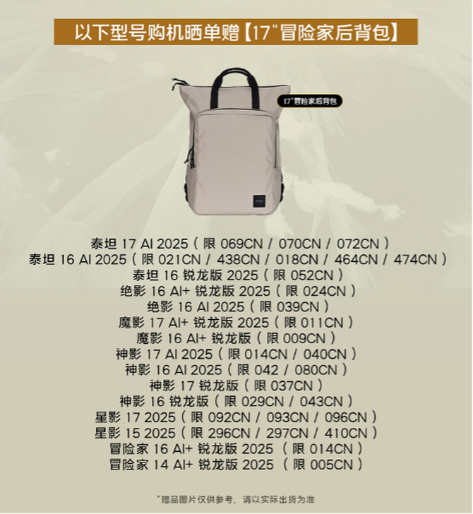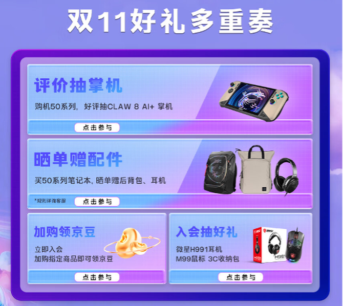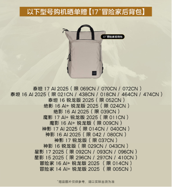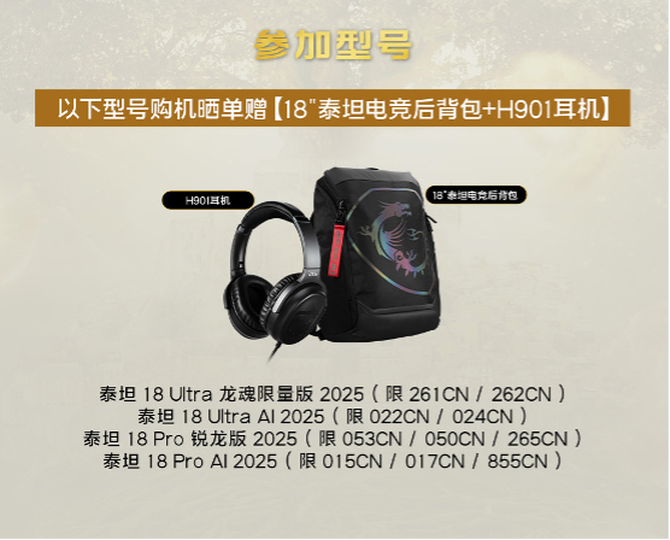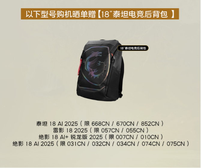 特别值得关注的是,微星为双11准备了丰厚的晒单好礼。活动期间购买指定型号微星游戏本的玩家,只需完成晒单即可参与买赠好礼,购买不同机型,晒单赢的好礼不同,其中包括18英寸泰坦电竞后背包+H901耳机组合、18英寸泰坦电竞后背包单品和17英寸冒险家后背包单品等,让您在享受高性能设备的同时,更有机会赢取额外惊喜。